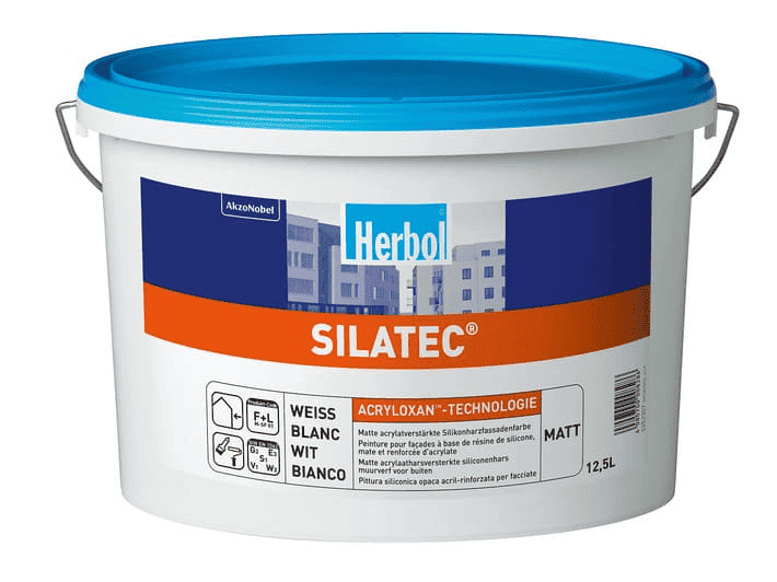 Herbol Silatec® ist eine wasserverdünnbare Zwischen- und Schlussbeschichtung für außen, mit hoher Fülle bei gleichzeitig leichter Verarbeitung. Durch die Acryloxan™-Technologie ergibt sich eine wetterbeständige, kreidungsstabile Oberfläche mit guter Kuppen- und Kantenabdeckung. Unverdünnt entsteht eine strukturausgleichende Beschichtung. Je nach Verdünnungszugabe kann das Produkt auch strukturerhaltend eingestellt werden. Das auf Acryloxan™-Technologie basierte Herbol Silatec® zeichnet sich durch eine matte, mineralisch anmutende Oberfläche mit geringer Wasseraufnahme und hoher Wasserdampfdurchlässigkeit aus. Das Produkt ist mit vorbeugendem Filmschutz gegen Algen- und Pilzbefall ausgerüstet. Die Wirkung ist abhängig von Gebäudekonstruktion, Umgebungsbedingungen und zeitlich begrenzt. Die IRF-Technologie sorgt bei dunkleren Farbtönen dafür, dass Fassaden weniger aufheizen und der Anstrichfilm weniger anfällig für Schäden durch thermische Spannungen ist (Total Solar Reflectance).
